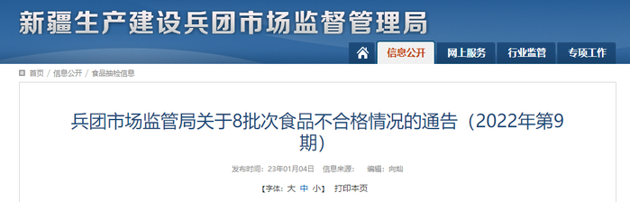 中国质量新闻网讯 2023年1月4日,新疆生产建设兵团市场监督管理局网站发布关于8批次食品不合格情况的通告(2022年第9期)。