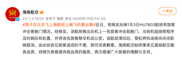 对此,海南航空1月4日通报:近日,有网友反映1月3日HU7603航班有旅客冲击客舱门情况。经核实,该航班推出后机上一名旅客冲击前舱门,当班机组按照程序及时响应和处置,并将该名旅客移交机场公安。该航班滑回后,受虹桥机场夜间关闭影响取消。由此给各位旅客造成的不便,我司深表歉意。海南航空始终秉承五星级航空服务品质,持续为旅客提供高品质的服务,再次感谢广大旅客的理解与支持。