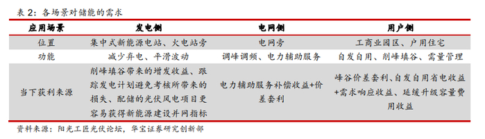 在用户侧储能可以发挥提升电力自发自用水平、峰谷价差套利等作用。在用户侧,储能主要安装在新工商业园区和户用住宅,当下电源侧储能电站的收益点主要来自于峰谷价差带来的电费节省。在未来落实分布式可再生能源+储能参与电力辅助服务市场机制,补偿需求响应价值等政策进一步完善的情况下,用户侧储能电站的收益还可包括需求响应收益、延缓升级容量费用收益、参与电力辅助服务市场所获取的收益等部分。