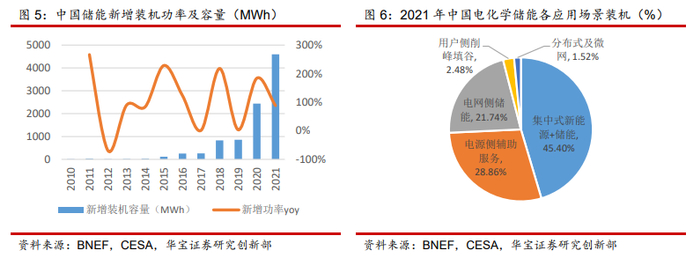 2021年国内新增储能中大储占比超过95%,占据主导地位。根据BNEF,2021年全球电化学储能新增装机为10GW/22GWh,分别同比+85.19%/+103.70%;同年中国新增装机为2.5GW/4.6GWh,分别同比+82.08%/+88.49%,从功率看,中国占全球新增的25%。根据CESA,2021年我国集中式新能源+储能、电源侧、电网侧储能占当期电化学储能装机的96%,大储在我国电化学储能市场中发挥着举足轻重的作用。