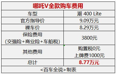 目前,哪吒V卖得较好的是9.09万(涨价之后的价格)的潮 400 Lite,现在优惠约8000元,全款购车总价约8.77万元。