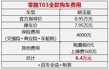 目前,零跑卖得较好的是8.95万(涨价之后的价格)的皓玉版,现在优惠约1万,全款购车总价约8.4万元。