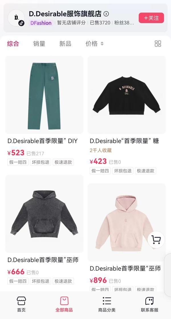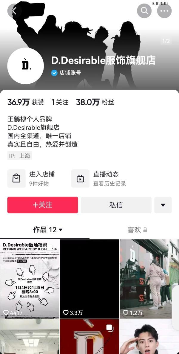1月3日,王鹤棣又在D.Desirable官方网店做直播,为潮牌吆喝。他的努力成效不俗。截至4日晚8点半,该店拥有粉丝38万,售出商品超过3700件。