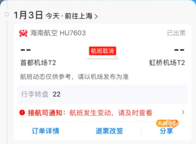 据都市快报报道,1月3日晚,从北京飞往上海的航班HU7603,起飞前突然遭遇意外事件。