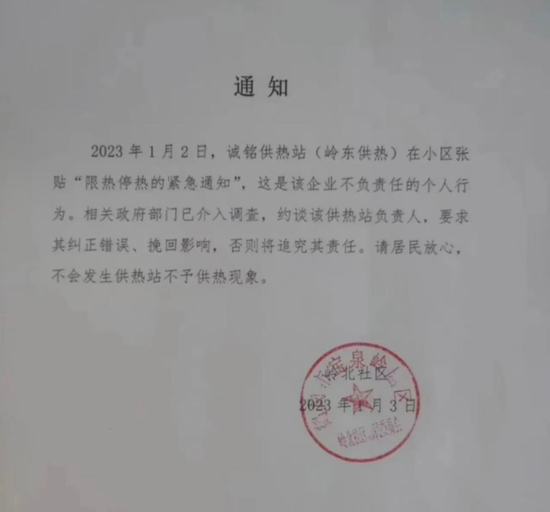 在收到供暖公司的紧急停止供暖通告后,1月3日当天,岭北社区当地居民也收到了当地社区发布的声明。该声明称,2023年1月2日,诚铭供热站(岭东供热)在小区张贴“限热停热的紧急通知”,这是该企业不负责任的个人行为。相关政府部门已介入调查,约谈该供热站负责人,要求其纠正错误、挽回影响,否则将追究其责任。该社区也回复红星新闻,已在协商解决,不会发生供热站不予供热现象。