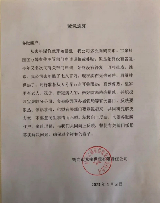 1月3日早上,黑龙江省鹤岗市宝泉岭岭东社区多位居民发现,楼下小区连夜张贴了一则紧急通知,该通告落款和盖章为鹤岗市诚铭供暖有限公司。通知称,从去年煤价就开始暴涨,该公司曾多次向鹤岗市、宝泉岭园区办等有关主管部门申请调价或补贴,但是始终没有答复。公司去年赔了七八百万,现在实在无钱可赔,无法再继续供热了。