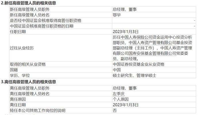 1月4日,国寿安保基金发布了高级管理人员变更公告。公告显示,自1月3日起,左季庆离任国寿安保基金总经理、董事职务,由鄂华新任公司总经理、董事。