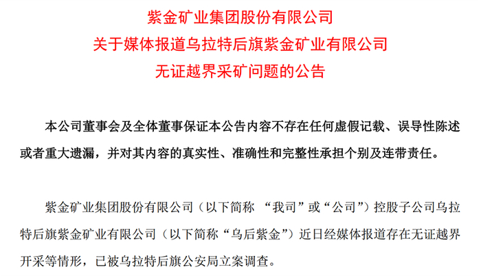 此事经媒体报道后,紫金矿业于2022年4月15日回应称,乌后紫金已被乌拉特后旗公安局立案调查。