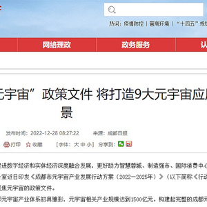 成都印发首个“元宇宙”政策文件,将打造9大元宇宙应用场景。为主动把握元宇宙产业发展机遇,促进数字经济和实体经济深度融合发展,更好助力智慧蓉城、制造强市、国际消费中心城市建设,成都市新经济发展工作领导小组办公室近日印发《成都市元宇宙产业发展行动方案 (2022—2025年)》(以下简称 《行动方案》)。这份《行动方案》是成都首个聚焦元宇宙的政策文件。