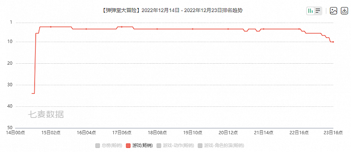 自12月14日上线后的下午开始,《弹弹堂大冒险》,就一直稳居畅销榜前10,且大多时间居于畅销榜前5。作为一款休闲弹射品类的页转手游戏,目前这个成绩可以说得上优秀了。
