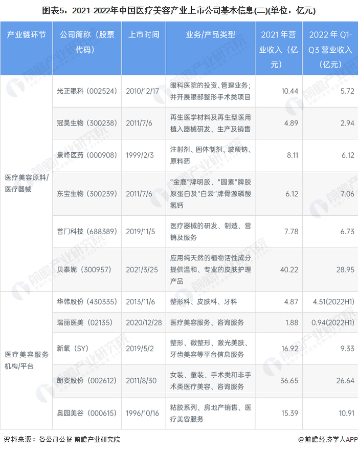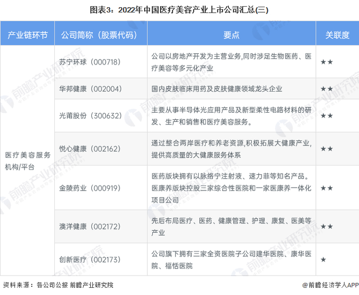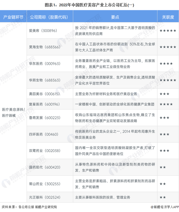 中国医疗美容行业上游主要包括医美原料和医美器械企业,中游为医疗美容服务平台或医疗美容服务机构,下游则为医美项目消费者。目前,中国医疗美容产业链包含的上市企业数量较少,具体包括: