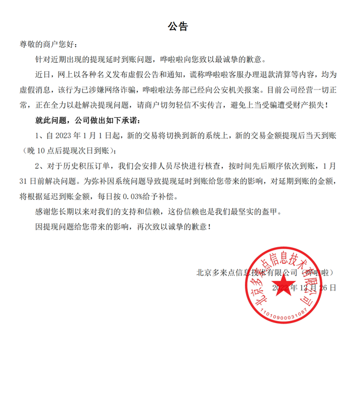 “1月1日起,新系统的新交易已恢复正常,商户可以正常提现。对于此前积压交易,仍需要人工梳理、核对。但如公告所说,1月份可以全部解决,并按照承诺补偿受影响商户。”哗啦啦在回复函中如是说。