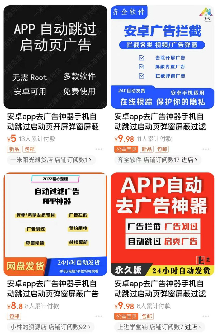 据商家介绍称,此类拦截软件适用于安卓、华为鸿蒙系统,用于拦截各类视频广告、弹窗广告和流氓软件,组织危险网站的加载。在商品评论中,有买家坦言道“终于能跳过大部分开屏广告了”。