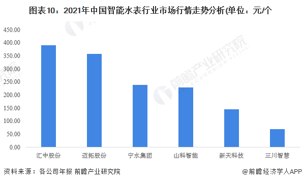 从中国智能水表行业的代表性企业的智能水表定价来看,2021年,汇中股份的智能水表平均单价最高,为391.81元/个,接近400元/个的水平;迈拓股份的智能水表平均单价为358.89元/个,排名第二;宁水集团以238.77元/个的平均单价排名第三。而汇中股份和迈拓股份主要是生产制造超声水表,可见在智能水表中,超声水表的平均单价要超出物联网水表、远传水表100元左右。整体来看,2021年我国智能水表平均单价的行业中值为233.80元/个。