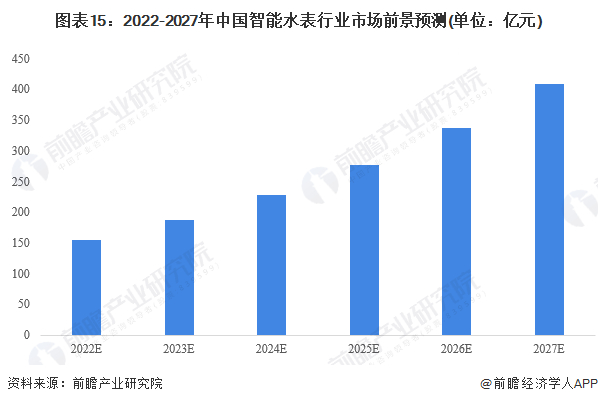 随着我国城镇化的推进、农村水务发展与城市水务信息化改造提速,智能水表整体政策环境向好,我国智能水表产品市场快速增长。预计2027年我国智能水表行业市场将达到409亿元,2022-2027年复合增长率为21%。