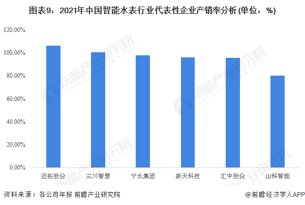 从中国智能水表行业的代表性企业的产销率来看,2021年行业整体的平均产销率为96.06%。其中,迈拓股份与三川智慧的产销率最高,均超过100%,分别为106.03%和100.33%;宁水集团以97.88%的产销率排名第三。