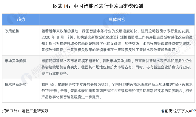 展望未来,智慧城市、智慧水务行业的发展将拉动智能水表的需求;市场竞争将愈发激烈,除传统的水表生产商向智能水表业务转型升级外,电表、气表、热表等终端表计企业也将涉足智能水表市场;随着5G、物联网等技术发展,现有水表的数字化和智能化程度将进一步提升。