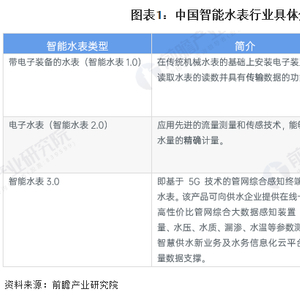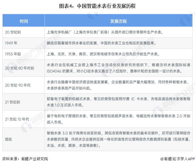 20世纪90年代,水表行业随着中国经济建设快速发展着,企业数量和总产量大幅增加,同时各种智能水表、水表抄表系统产品开始兴起;21世纪初,配备电子装置的机械式水表,常见的类型包括预付费IC卡水表、光电直读远传水表等智能水表1.0正式进入市场;目前,智能水表3.0处于商用化研发阶段,其包含现有智能水表的基本功能外,还可进行管网综合水参数的测量,向供水企业提供在线一体化的高性价比管网综合大数据感知装置。