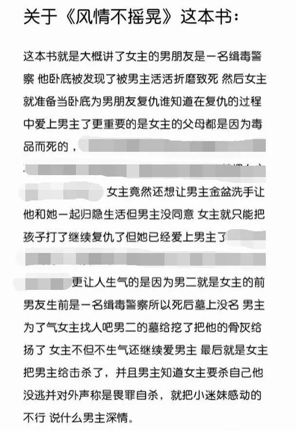 文中配的视频显示,被批评的是一部名为《风情不摇晃》的网络小说,据悉,这部小说讲述了女主为给缉毒警男友报仇,卧底接触大毒枭,而后和他谈恋爱,最终将毒枭送入监牢的故事,该小说现已出版。