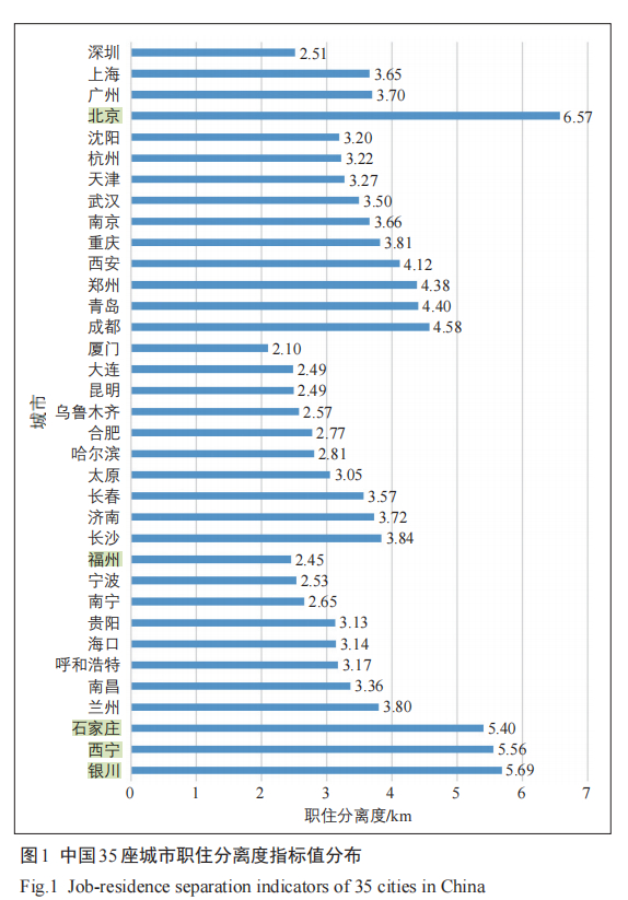 结果发现,一些中型城市的职住分离比一些大城市还严重。比如,超大城市深圳的职住分离度仅2.5千米,相比之下,城市规模比深圳小得多的东莞和石家庄的职住分离度却是它的两倍有余[5]。