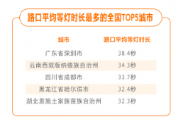 从路口平均等灯时长来看,一线城市及热门旅游城市的路口平均等灯时长更为显著。元旦首日,全国每个路口平均等灯时长约25.11秒,威海用户单程等灯时长最短最舒心,深圳、西双版纳、成都等城市用户等灯时长最多,其中深圳为38.4秒,超出全国水平52.1%,相比威海多出25.9秒。