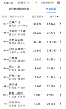 出行人气也转化为强劲的消费力,促成了城市商业消费的火爆,重庆、北京、广州等多地街头巷尾烟火气归来。百度地图购物中心客流量数据显示,1月1日,重庆三峡广场、重庆龙湖时代天街、西安赛格国际购物中心、北京荟聚中心等进入榜单,其中,北京荟聚中心客流指数较平日上涨高达235.78%,迎来久违的消费热潮。扩大到城市来看,百度地图复苏指数显示,元旦期间,乐山、深圳、佛山消费指数较上周同期增幅最大,此外,来自广东省、江苏省的沿海城市在消费指数增幅榜单中较为突出,前20城中占据10席,市场消费持续回暖,经济活力进一步释放。
