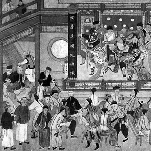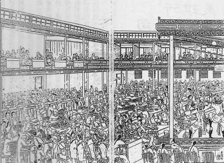 宋元时期,经济蓬勃发展,戏剧也跟着蓬勃壮大起来。大概在宋仁宗时,戏班子进入搭着大棚子的瓦舍勾栏之内演出。“瓦舍”,泛指有各种玩意儿的娱乐场所,面积很大;“勾栏”则专指在瓦舍内演戏的地方,也就相当于现在的剧场。勾栏也有大小之分,据有关记载,勾栏是长方形的,像一个木箱子,四壁是用木板拼接而成,只有一个门供观众进出。勾栏正面有舞台,围绕着舞台有绘着花纹的栏杆,勾栏指的就是这个。舞台前面是木质的观众席,进入勾栏的观众,虽然不编号,不能对号入座,但这次都能混上个座位。舞台的后面是演员扮戏的后台,叫“戏房”,前后台用屏风或木板隔开,演员从后台到前台演出,还有上、下场门。不过,这样的剧场,因为经常是临时搭建,不坚固,所以也常常发生勾栏倒塌、压死观众的情况。故此,到了明代,勾栏就越来越少了。