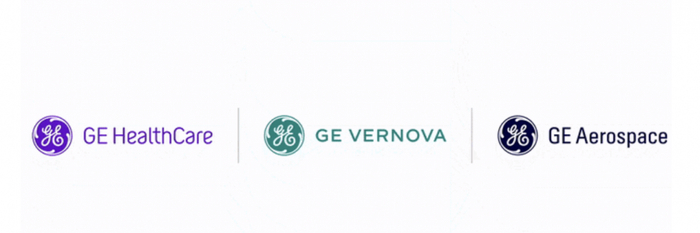 2022年7月,GE发布了其拆分后的三家公司的名称和品牌标识,医疗板块启用GE HealthCare的名称;GE能源业务包括了可再生能源、发电、数字业务和能源金融服务,使用GE Vernova的名称;GE航空业务使用GE Aerospace的名称。上述三家企业仍延续使用GE原有的品牌标识,但更换了配色,其中GE HealthCare的配色为紫色,GE Vernova的标识为绿色,GE Aerospace的标识为蓝黑色。