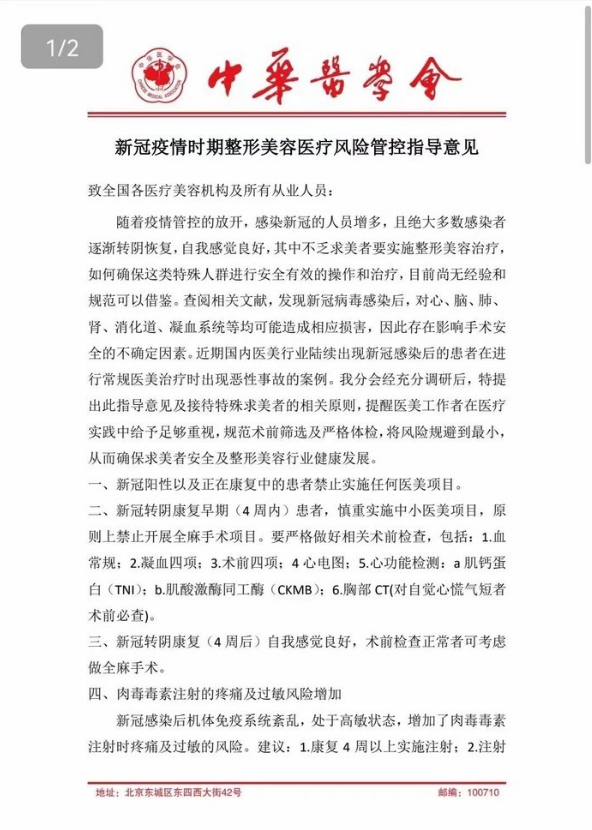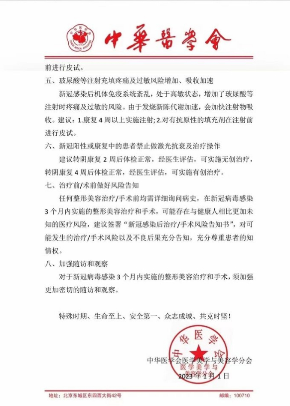 分会经充分调研后,特提出,新冠阳性以及正在康复中的患者禁止实施任何医美项目;新冠转阴康复早期(4周内)患者,慎重实施中小医美项目,原则上禁止开展全麻手术项目。要严格做好相关术前检查。