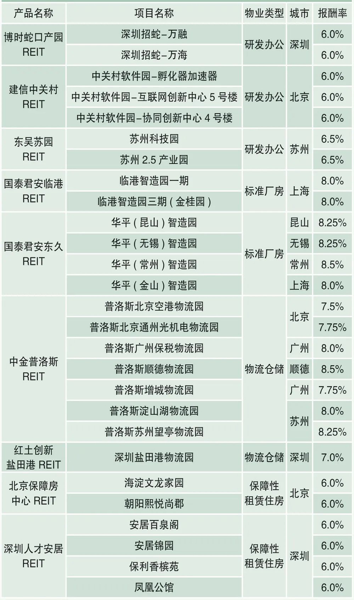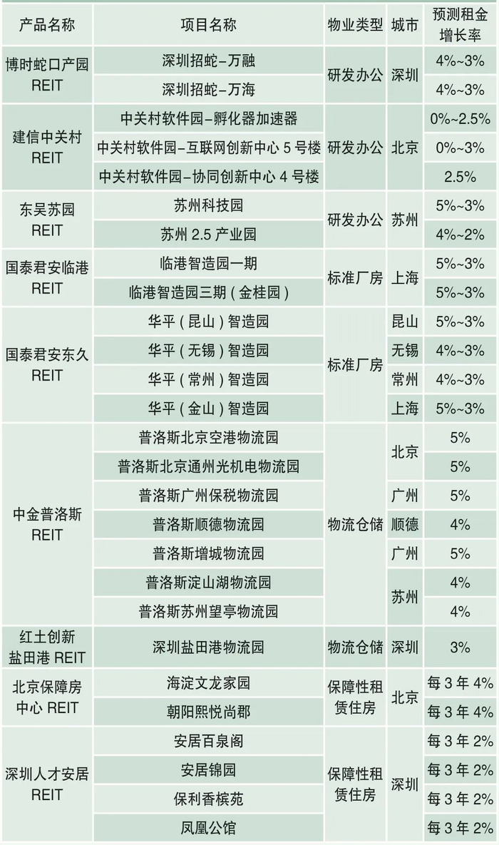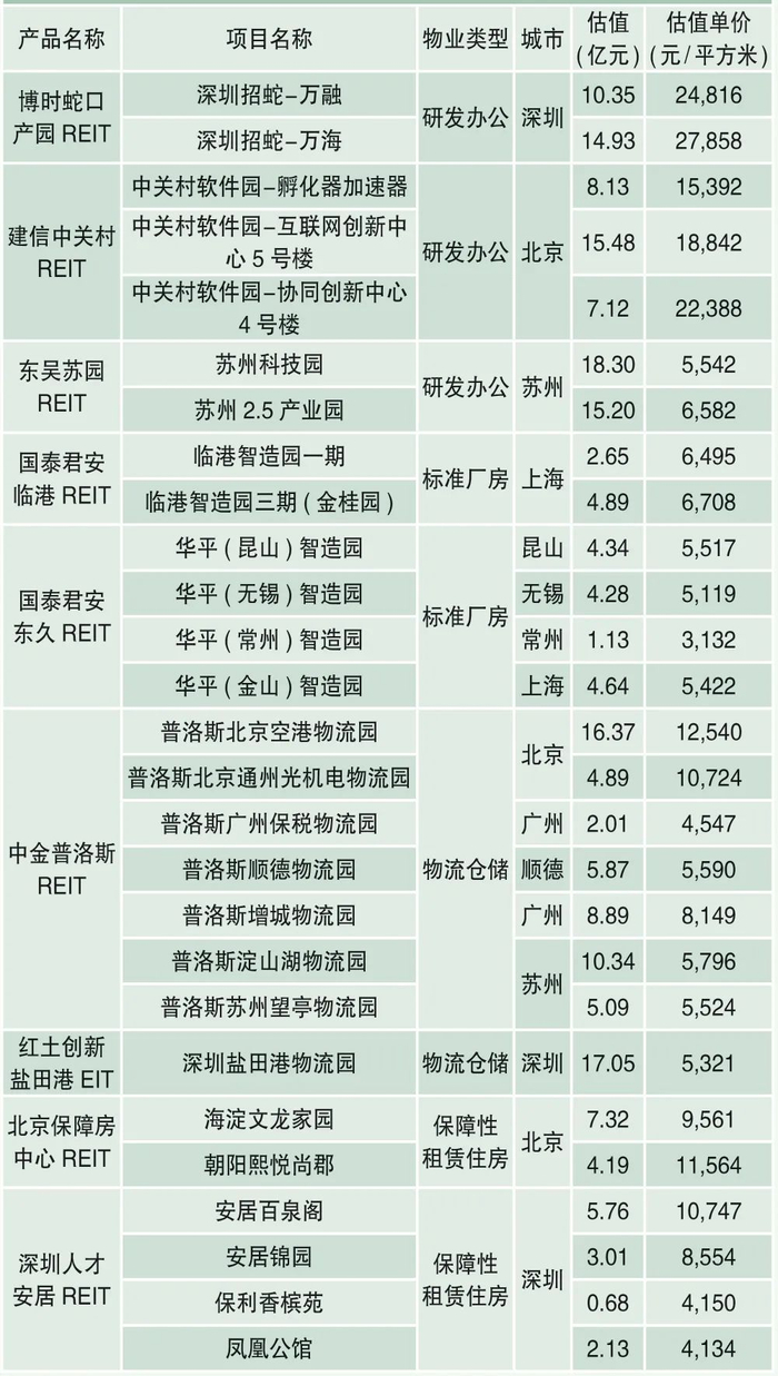截至2022年10月31日,已上市产权类REITs共有12只,其中应用上述方法对底层资产进行估值的有9只,包括产业园类(含研发办公和标准厂房)REITs共5只,分别为博时蛇口产园REIT、建信中关村REIT、东吴苏园REIT、国泰君安临港REIT及国泰君安东久REIT;仓储物流类REITs共2只,分别为中金普洛斯REIT和红土创新盐田港REIT;保障性租赁住房类REITs共2只,分别为北京保障房中心REIT和深圳人才安居REIT。对上述产品中底层资产估值的核心参数及估值结果进行分析如下。