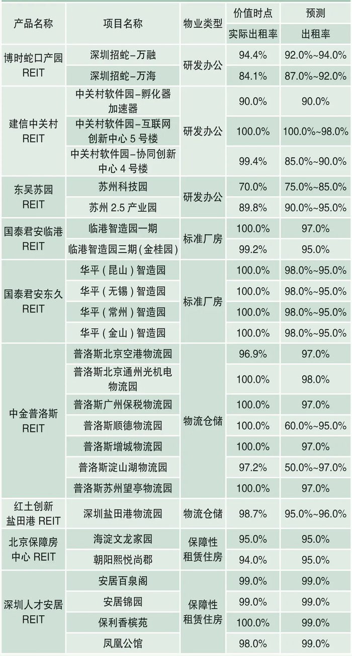REITs产权类资产于价值时点的实际出租率与预测设定出租率情况如表2所示。