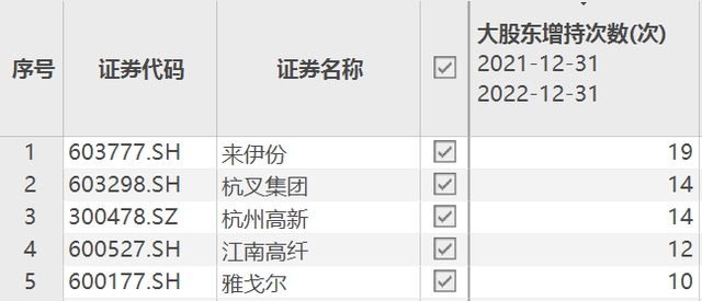 2022年,知名食品企业来伊份获得大股东增持的次数最多,为19次。