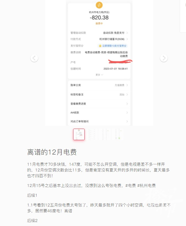 据杭州网今日报道,小红书一位杭州网友晒出了自家12月的电费账单:820元。