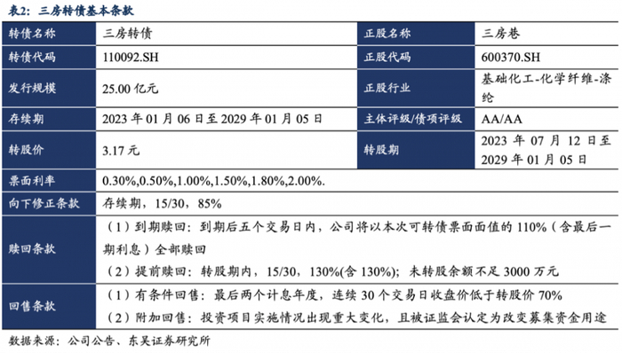 ■当前转换平价为98.11元,平价溢价率为1.93%。转股期为自发行结束之日起满6个月后的第一个交易日至转债到期日止,即2023年07月12日至2029年01月05日。初始转股价3.17元/股,正股三房巷1月4日的收盘价为3.11元,对应的转换平价为98.11元,平价溢价率为1.93%。
