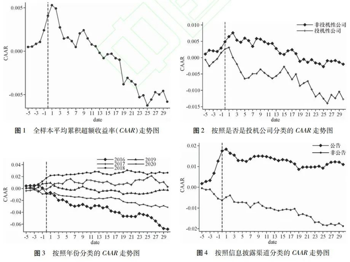 图4为按照信息披露渠道进行分类的CAAR走势图。结果显示,通过重大事项变动公告披露区块链信息的公司累积超额回报在事件日前3天开始快速上涨,在事件日达到峰值,小幅下降后保持长期正向趋势。原因可能是公告发布前存在信息泄露,市场提前做出积极反应。另一方面,本文重大事项变更公告是公司在区块链方面的发展或与投资者利益相关的重大事项,此公告披露的信息是关于区块链进展的实质性行动,因此能够增强投资者信心,并有助于提升公司价值。