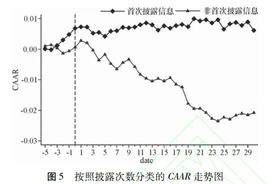 图5为按照是否首次披露区块链相关内容进行分类的CAAR走势图。可看出在事件日附近,两者均迎来积极的市场反应,但是首次披露产生的公司价值上涨幅度更大,且资本市场有长期积极反应。说明首次披露区块链信息更能激发投资者热情,资本市场反应积极且持久。随着公司披露次数的增加,投资者对区块链的收益和风险有了更多的了解,资本市场逐渐恢复理性,投资热情下降,甚至会出现不利于公司价值提升的结果。