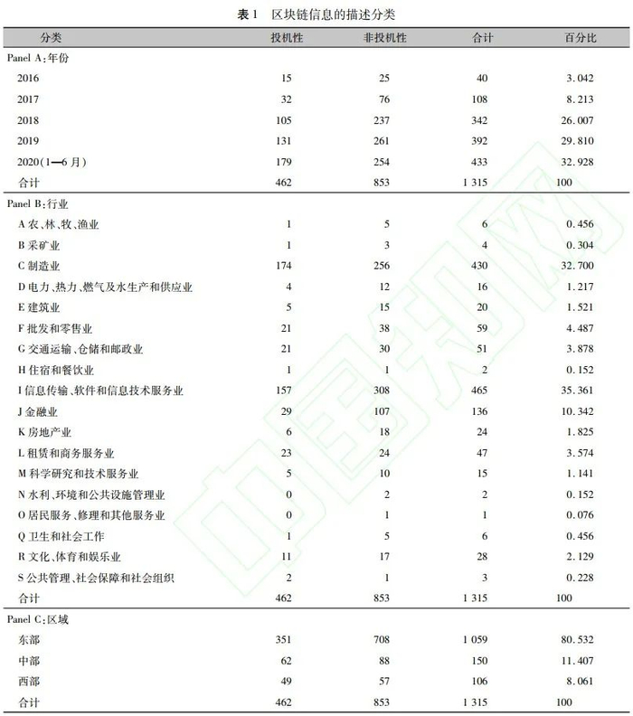 表1按年份、行业和地区三个维度描述了中国区块链的发展现状。Panel A显示,2018年1月至2020年6月披露区块链信息的样本占比为88.745%,时间相对集中,表明这期间企业对区块链的兴趣较高。同时,2016—2020年非投机性信息披露高于投机性信息披露,说明虽然区块链信息披露存在机会主义行为,但仍以非机会主义信息披露为主。Panel B显示,披露区块链信息的公司主要集中在商业设备行业(即信息传输、 软件和信息技术服务业,35.361%)、制造业(32.700%)和金融业(10.342%),与国外相比,中国披露区块链信息的公司集中于制造业 。区块链在制造业中的应用体现了国家提出的区块链与实体产业深度融合的发展战略。Panel C显示,披露区块链信息的企业样本分布在东部地区的占比高达80.532%,其中广东和北京占比分别为25.883%和23.142%,二者之和接近50%,浙江和上海次之,分别为12.594%、9.733%,说明披露区块链信息的样本主要集中在东部经济发达地区。