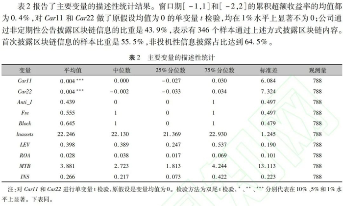 本文以2016—2020年6月中国沪深A股上市公司为初始样本,基于临时性公告、年报和季报等与公司区块链投资相关内容的整理和分析,最终获得725家1315个观察值 。在表1的基础上对研究样本进行如下处理:剔除金融类和被特殊标记的样本;剔除在事件日前后5天有兼并、收购或重组等重大事项变更的样本;剔除两个事件间隔小于210日的样本;剔除采用市场模型估计时估计窗口小于30个交易日的样本;剔除主要变量缺失的样本。最后保留516家上市公司788个样,为避免极端值的影响,对连续型变量在上下1%水平上进行缩尾处理。本文财务数据来自国泰安(CSMAR)数据库,其他数据来自中国研究数据服务平台(CNRDS)数据库。