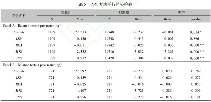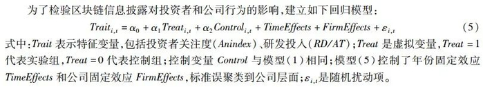 为考察区块链信息披露对投资者的影响,本文基于PSM方法构建配对样本。具体来说,首先将披露区块链信息的样本设为实验组,模型(1)中所有控制变量作为匹配变量,使用logit模型进行估计,由此计算出每个上市公司成为实验组的概率。其次,使用一对一无放回匹配为每个实验组找到一个概率得分与其最接近的控制组,匹配过程中剔除不符合共同支撑假设和匹配失败的样本。最终,匹配后得到1442个样本。PSM匹配的平行趋势检验结果见表5,可发现PSM方法匹配后的实验组与控制组特征变量的差异性检验均不显著,满足PSM方法所需的平行趋势假设,说明了PSM匹配的有效性。