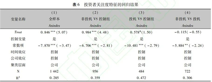区块链是目前资本市场热门的投资项目,更易激发市场情绪,吸引投资者关注,尤其是中国资本市场以散户参与为主,热点题材更易受到投资者青睐。借鉴已有文献(张继德等, 2014; 俞庆进和张兵, 2012)[35-36],本文采用网络搜索指数作为投资者关注度的代理变量,分析披露区块链信息这一事件对投资者关注度的影响。根据PSM匹配样本,将搜索指数的自然对数作为被解释变量(Anindex)。从表6第(1)列的回归结果可知,Treat系数在1%水平上显著为正,即相较于控制组,披露区块链信息的公司有更高的投资者关注度。为了进一步探究非投机性样本和投机性样本的差异,依据前文定义,把实验组分为非投机行性信息披露和投机性信息披露进行回归分析,结果见(2)(3)列。第(2)列Treat系数在1%水平上显著为正,第(3)列Treat系数为正,p值为13.3%,虽然在10%的水平不显著,但仍然认为该P值是可以接受的。因为(3)列样本不足500个,是小样本回归,在使用小样本进行回归分析时,p值可以放宽至20%(罗知和齐博成, 2021)[37]。回归结果表明,非投机性样本和投机性样本均可吸引较高的投资者关注。第(4)是非投机性样本相对投机性样本的回归结果,可以发现二者在投资者关注度方面没有显著差异。原因可能是,以散户为主体的中国股市热衷于追逐热门投资项目,区块链作为新型数字技术,因为其复杂性使投资者缺少量化其风险和收益的能力,可能导致对区块链相关信息甄别不充分而出现盲目追逐市场热点的情形,从而引起市场情绪高涨。因此,即使区块链信息披露是投机性行为,也能够吸引投资者关注。