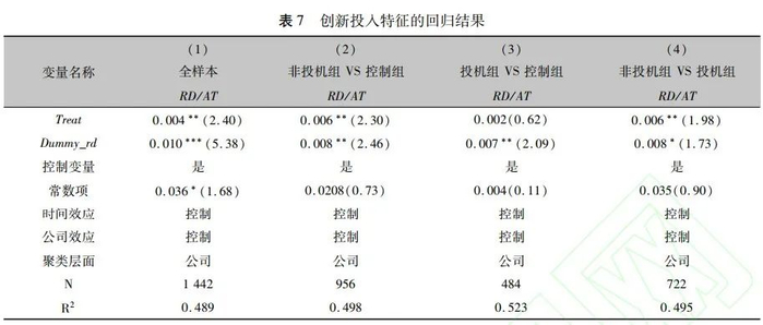 区块链自身的技术优势颠覆了传统产业运行模式,在经济发展中具有重要的应用价值,且区块链作为国家数字经济发展的重要支柱,得到各级政府的政策激励,这两方面均有助于提高公司增加研发投入的动力。借鉴Fama 和 French(2002)[38]、Flannery 和 Rangan(2006)[39]的研究,将研发投入空缺值替换为0,为了缓解由此可能带来的样本选择偏误,加入是否公布研发投入的虚拟变量作为控制变量,以此区分研发投入真实值与缺失值。首先,生成Dummy_rd哑变量,公布研发投入的样本哑变量取值为1,否则取值为0;其次,将研发投入变量(RD)的缺失值取值为0;最后,将研发投入变量和Dummy_rd哑变量同时加入回归方程。采用研发投入占期末总资产的比值(RD/AT)表示创新投入(Chen 等, 2019)[26],表7第(1)列回归结果显示,Treat的系数在5%水平上显著为正,表明披露区块链消息的公司相比控制组研发投入更高;第(2)是非投机性样本作为实验组得到的回归结果,相比于控制组,创新投入在5%水平上显著为正;第(3)列是投机性样本作为实验组,Treat系数为正但不显著;第(4)是非投机样本相对投机样本的回归结果,表明非投机样本研发投入显著高于投机样本。说明披露投机类消息的公司并没有投入更多的资金用于技术创新。可能的原因是公司披露投机性消息的主要目的是“蹭热点”,从而达到在短期内获得股票溢价的目的,而并未在区块链方面有实质性行动,因此未增加研发投入。