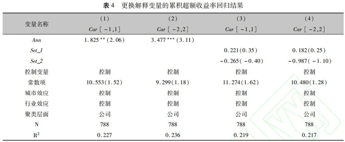 为进一步检验非定期性公告与定期性公告的差异,将非定期性公告中的临时性公告,即与区块链相关的重大事项公告取值为1(Ann),其他取值为0(Ann)。如:东旭蓝田发布关于能源区块链公司融链科技的重大事项公告,变量Ann取值为1。在表3中,是否首次披露区块链信息对资本市场没有显著影响,此处检验该结论的稳健性,以第1次披露区块链信息为基期,第2次披露的虚拟变量set_1取值1,否则为0,第3次及以上虚拟变量set_2取值1,否则为0。回归结果见表4。表4(1)(2)列结果表明,通过临时性公告披露信息显著提升了公司市场价值。(3)(4)列中变量set_1和set_2系数均不显著,说明披露区块链信息的次序对公司价值没有显著影响。说明表3的结论具有稳健性。