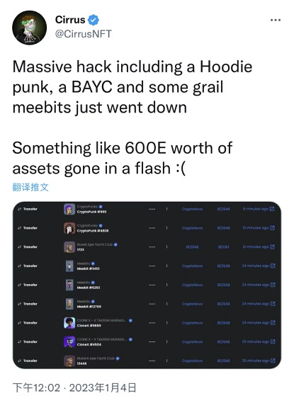 1月4日,据派盾监测,一GMX巨鲸遭黑客攻击,黑客共盗取82519枚GMX,约合340万美元,并兑换为2627枚ETH,随后将所有ETH跨链至以太坊网络。同样在1月4日,出现针对CryptoPunk、BAYC等NFT的大规模黑客攻击,损失NFT价值超600ETH,约合74.88万美元。
