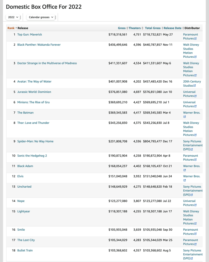 这不仅仅是中国市场的特殊现象,根据澎湃新闻报道,2022年,北美市场上映影片总数不足450部,远低于2019年的792部。票房统计网站Box Office Mojo的数据显示,2022年北美票房73.7亿美元,虽然比2021年的44.8亿美元上涨了64%,但大大低于2019年的113.6亿美元。在这400多部电影中,票房超过1亿美元的电影共18部,远少于2019年的29部。