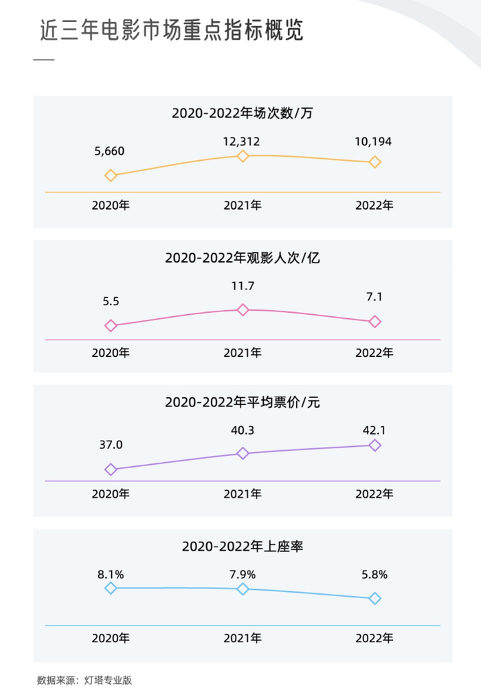国家电影局统计数据显示,2022年中国电影市场年度总票房为300.67亿元,相比2021年的470.36亿下降了36.4%。大幅下降的不只是票房,根据灯塔专业版数据,总场次从2021年的1.23亿场下降至1.02亿场;观影人次从2021年的11.7亿下降至7.1亿,走进电影院的人明显减少了;上座率在三年内持续下滑,2020年是8.1%,2021年是7.9%,2022年仅5.8%;相比而言,只有电影票价连年上涨,2020年平均票价37元,2021年是40.3元,2020年达到了42.1元。