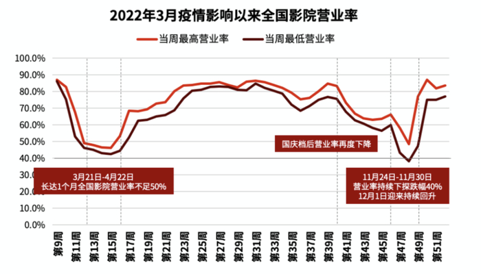 猫眼数据显示,2022年3月21日-4月22日,长达一个月全国影院营业率不足50%;暑期档营业率有明显回升,然而在10月份国庆档后营业率再度下降;11月24日-11月30日,营业率持续下探跌幅40%。拓普数据亦显示,2021年暂停3个月以上影院不到3000家,2022年这一数量大幅攀升,突破7000家,全行业面临重压。
