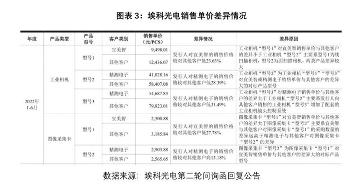 对于价格差异较大的原因,埃科光电在问询函回复中称,主要系宜美智与其他客户对工业相机“型号1”、图像采集卡“型号1”的采购量差异远超其他产品,公司给予了宜美智较大的价格优惠。工业相机“型号3”对精测电子销售单价与其他客户的差异大于其他产品,主要系公司向其他客户销售的工业相机“型号3”增加了配套的外购件所致。