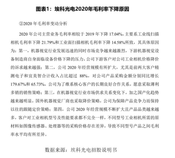 对于2020年毛利率下滑的原因,埃科光电在招股书中称,这与行业竞争加剧,为了维系与核心客户关系,降价采取薄利多销的销售策略等有关,具体如图表1所示。