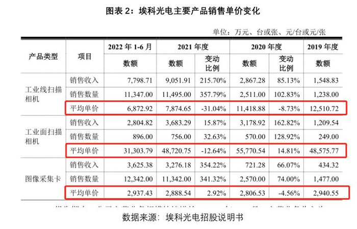 招股书显示,2019—2021年,埃科光电业绩高速增长,营收从0.34亿元提升至1.64亿元,主要产品工业相机的市场份额从1.53%增长至4.42%。然而同期其毛利率却从64.4%大幅下降至48.6%,销售收入最高的产品“工业线扫描相机”单价从1.25万元下降至0.69万元,几近腰斩。