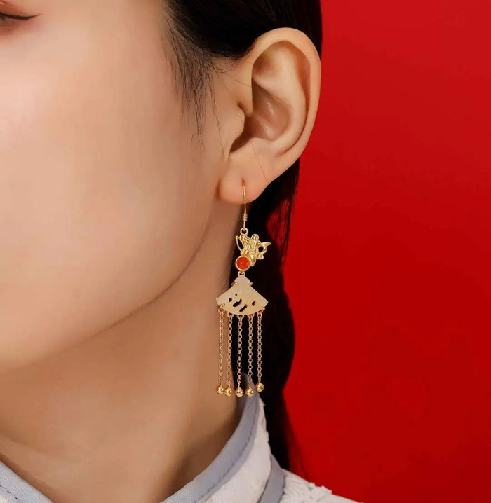 玉色扇面浮雕花纹,金黄色花样,镶嵌砖红色天然南红石耳钉,造型灵动绝美,仙气飘飘。